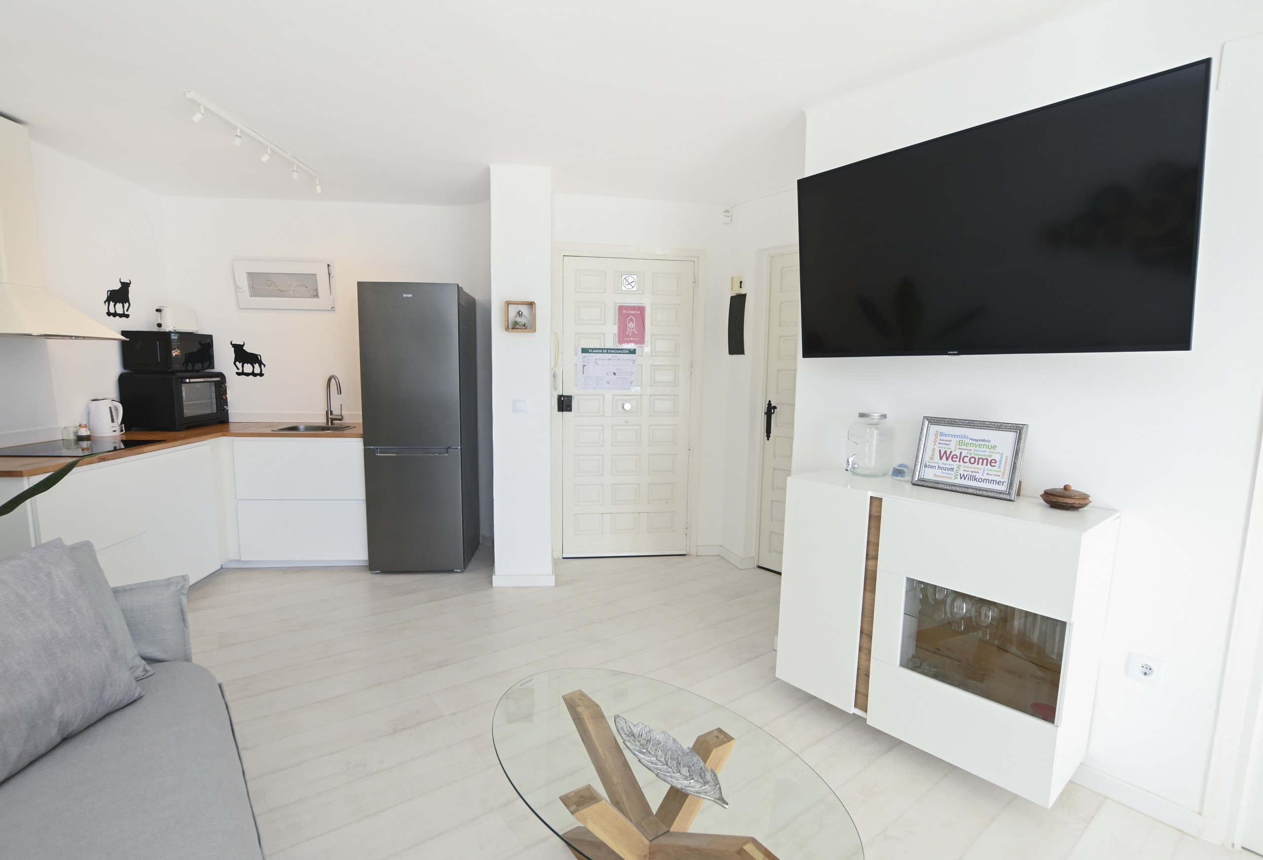 Кухня, совмещенная с залом, оснащена плитой с керамическим покрытием, оборудовано холодильник, микроволновая печь, духовка, морозильная камера, столовые приборы, кухонная утварь, кофеварка, тостер и Чайник.